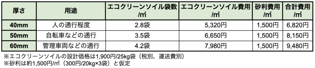 庭の通路など人が歩く程度の場所であれば、「エコクリーンソイル」の厚さが40mmで施工でき、砂利費用も含めると1㎡あたり6,820円(税別)で済みます。
