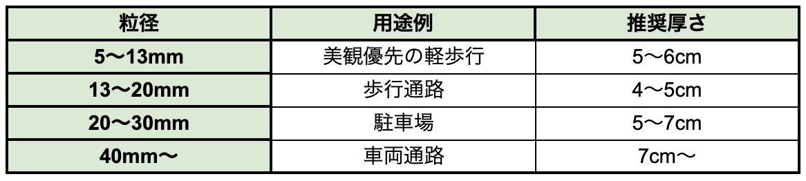 用途に応じた粒径と推奨厚さの目安は以下です。