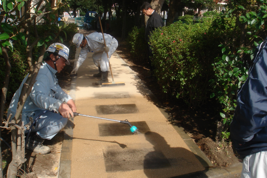 強度が発現できていれば、すぐに剥がれるようなことはありません。実績でのご紹介になりますが、駐車場においても10年以上、問題なくご利用いただいております。