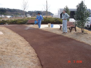 ⓵下地処理-1の工程を終了後、新しく敷設するエコクリーンソイルとの接触面(接触部)へ1㎡あたり1L程度のエコクリーンエイドを散布もしくは、散布・塗布し少し湿潤な状態にする。